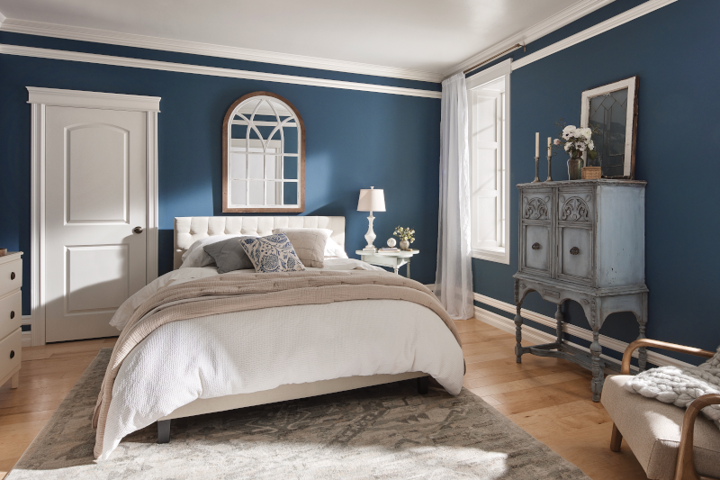 Instale la moldura guardasillas justo por encima del zoclo y por debajo de la corona para crear un atractivo visual y un bonito marco en la pared. Colocar chambranas blancas sobre la pared más oscura añade un bonito toque de color.
